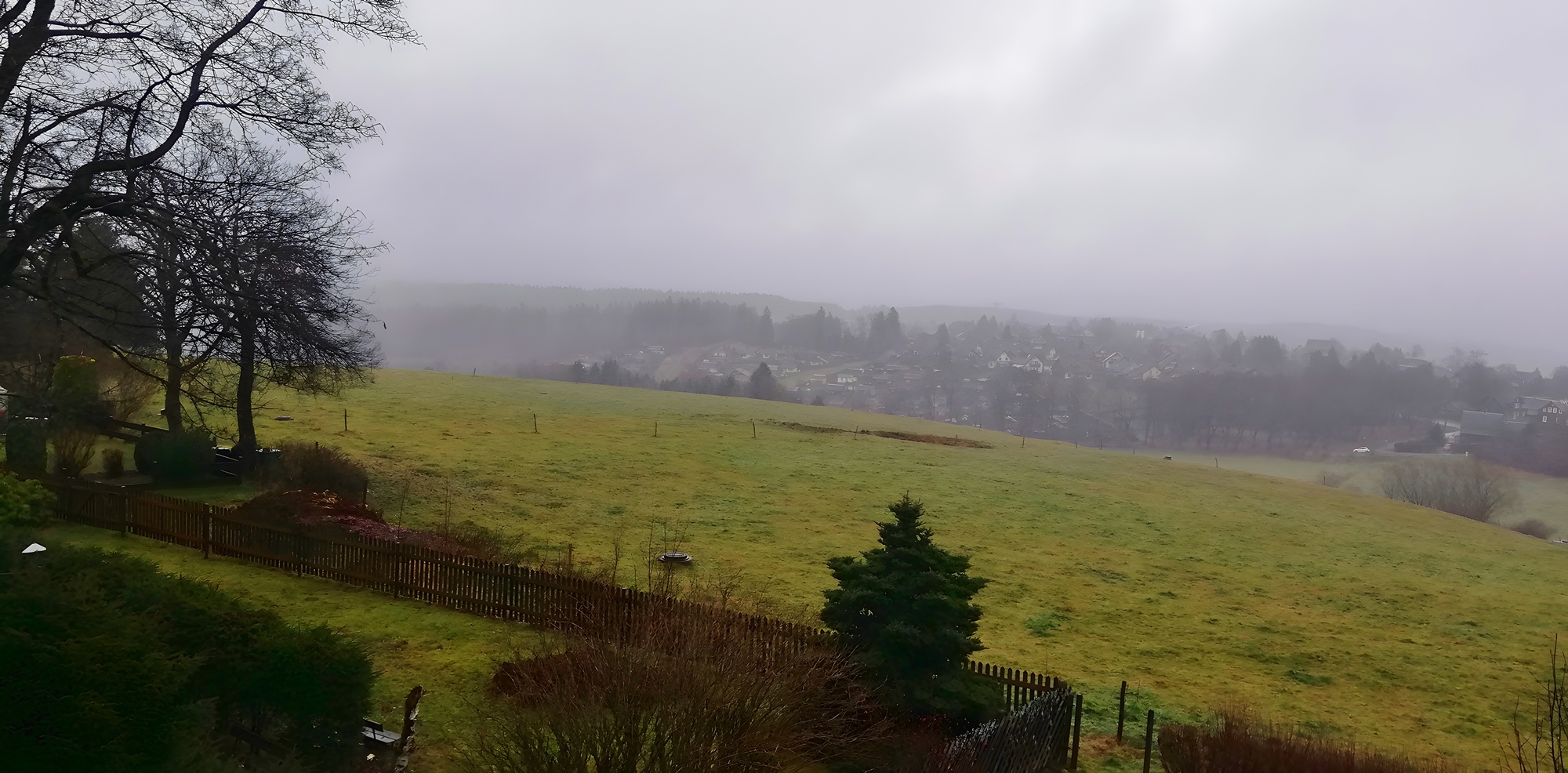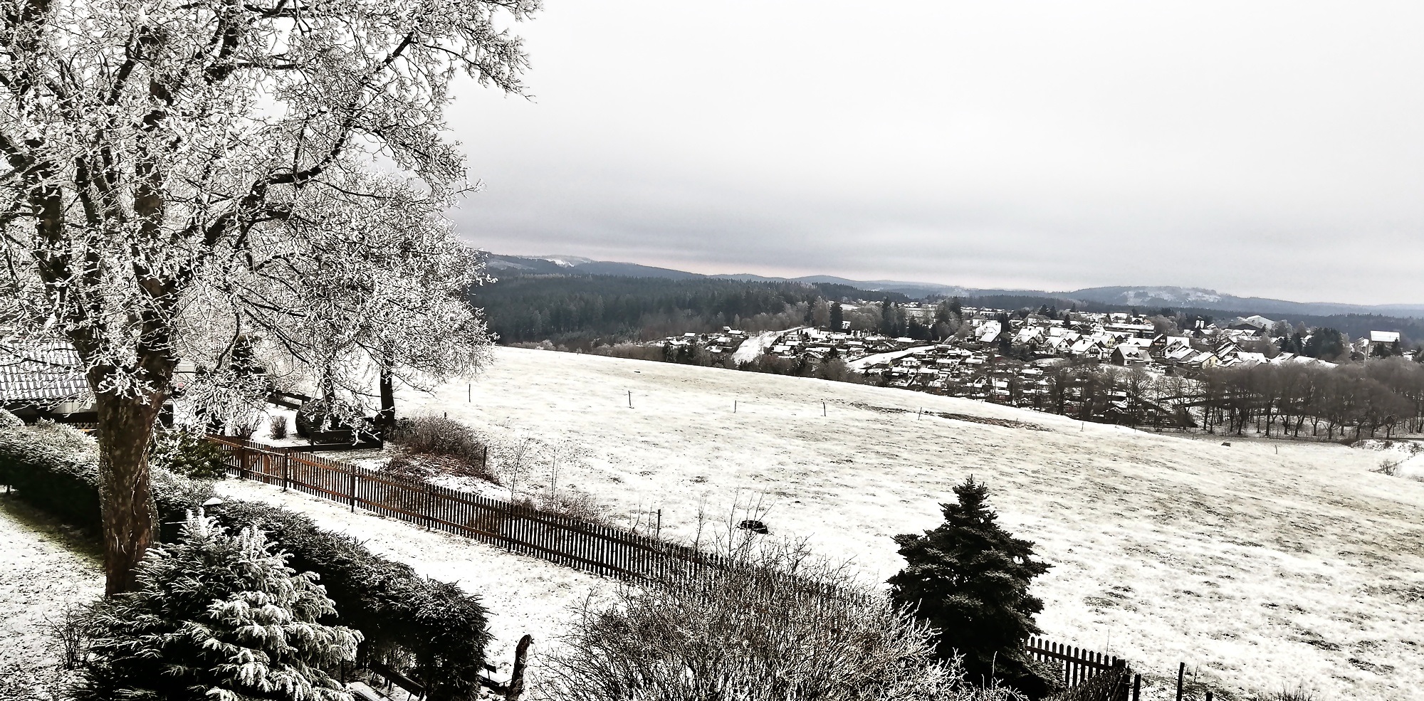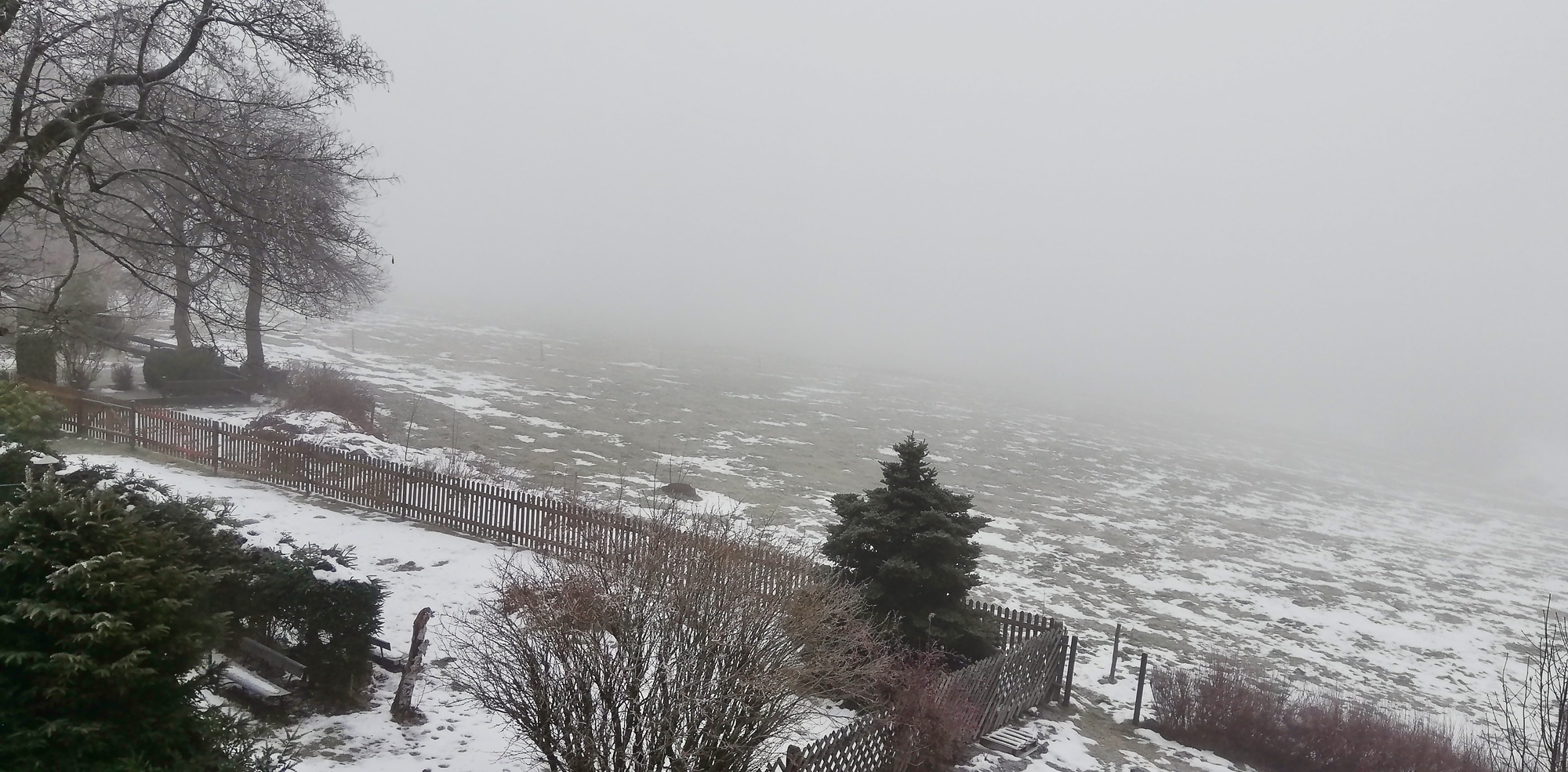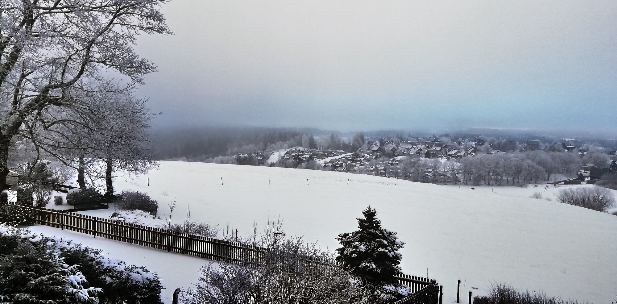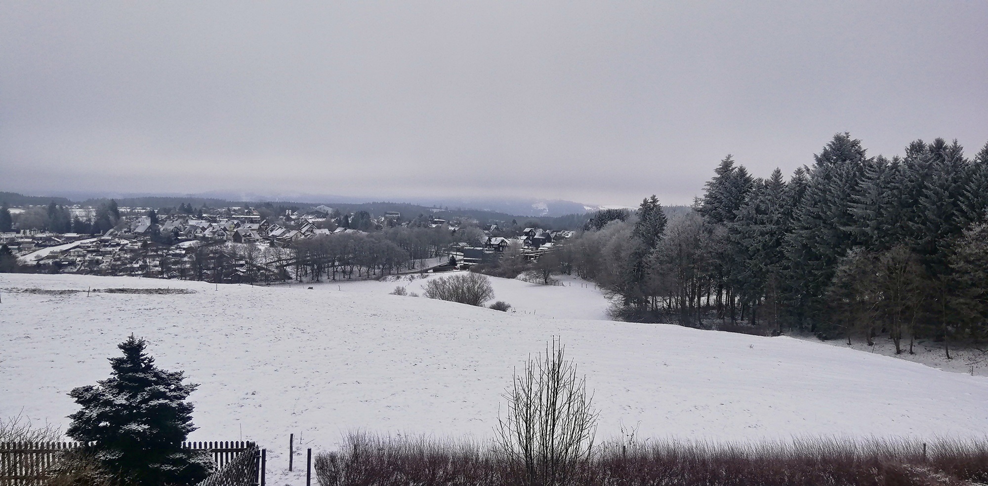 Das Foto von heute (8.1.26) zeigt eine ruhige Winterlandschaft vor Schneefall und starkem Wind. Im Verlauf der Nacht zum Freitag setzt länger anhaltender und ergiebiger Schneefall ein. Zusammen mit sehr starkem Wind aus Südwest wird das in freien Lagen zu Schneeverwehungen führen. Verkehrsbehinderungen nicht nur auf Nebenstraßen werden das Ergebnis sein. Wer nicht Autofahren muss, sollte darauf verzichten.